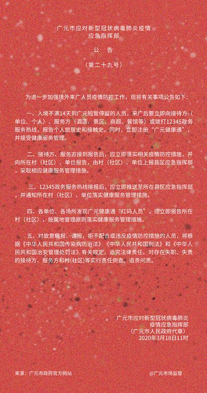 3月18日,廣元市應(yīng)對(duì)新型冠狀病毒肺炎疫情應(yīng)急指揮部發(fā)布第29號(hào)公告。