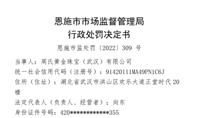 行政處罰信息顯示,2021年9月11日,恩施市市場監督管理局接恩施市人民政府交辦指令:周氏金滿滿珠寶(恩施州)有限公司推廣“金滿滿”APP 線上銷售黃金,并對外宣稱“買黃金、送黃金、賺黃金”、“購買10000g 黃金,得 90000g 黃金,額外賺3.6億”,該經營活動存在重大金融風險,要求該局核查處置。