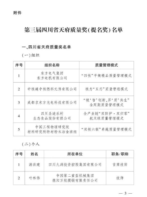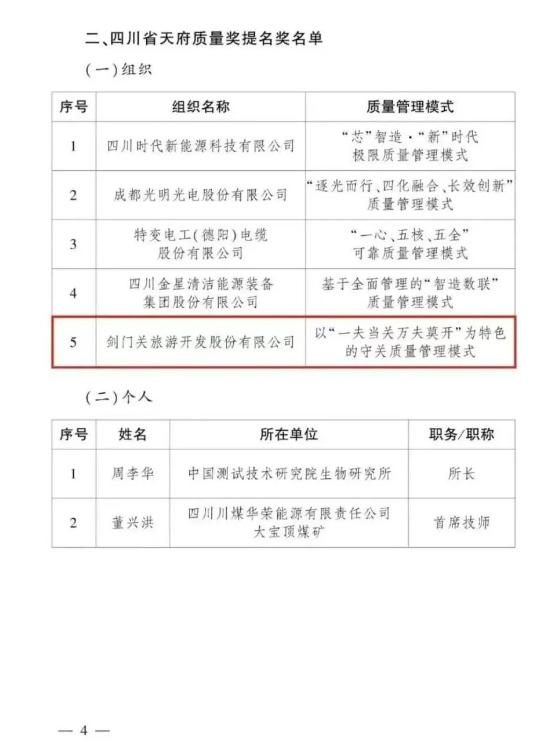 2025年8月,省政府決定開展第三屆四川省天府質量獎評選,由省市場監管局牽頭,各市(州)政府負責審核推薦。12月31日,省政府發布表彰決定,廣元、成都、德陽、綿陽、宜賓5個市州的10個組織獲獎。其中,劍門關旅游開發股份有限公司榮獲第三屆四川省天府質量獎提名獎,實現廣元參與歷屆天府質量獎評選“零”的突破。